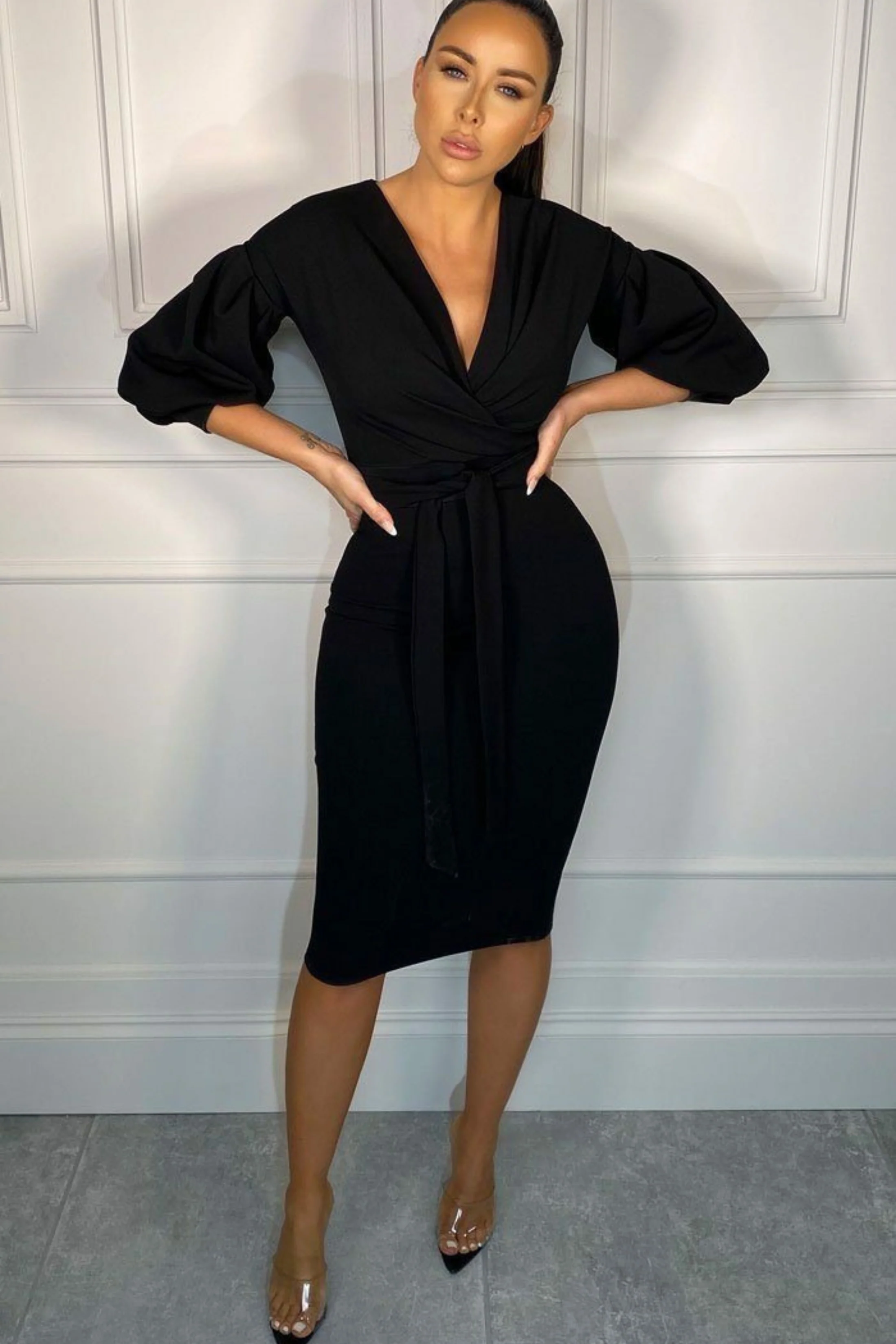 Black Belted Bodycon Midi Wrap Dress - Angelica