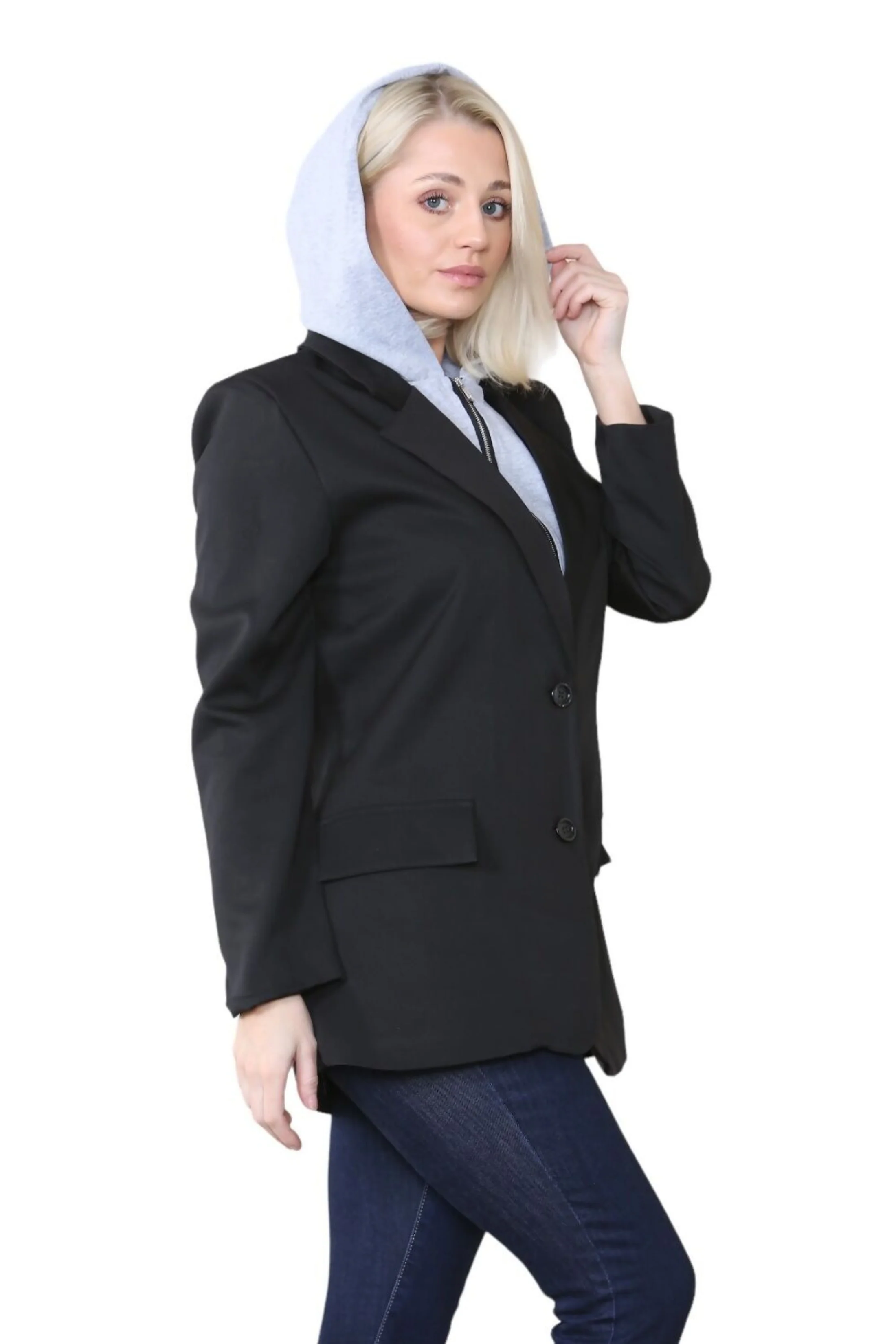 Upgrade your outerwear game with this black hooded insert blazer. Featuring a classic tailored blazer design with a contrast grey hooded inner layer, this piece is perfect for creating effortless smart-casual looks. Pair with jeans and trainers for a laid-back vibe or dress it up with tailored trousers and heels for a chic finish.