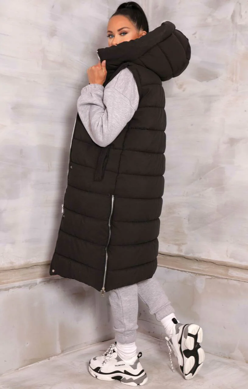 Black Sleeveless Longline Midi Zip Up Hooded Puffer Coat - Terri