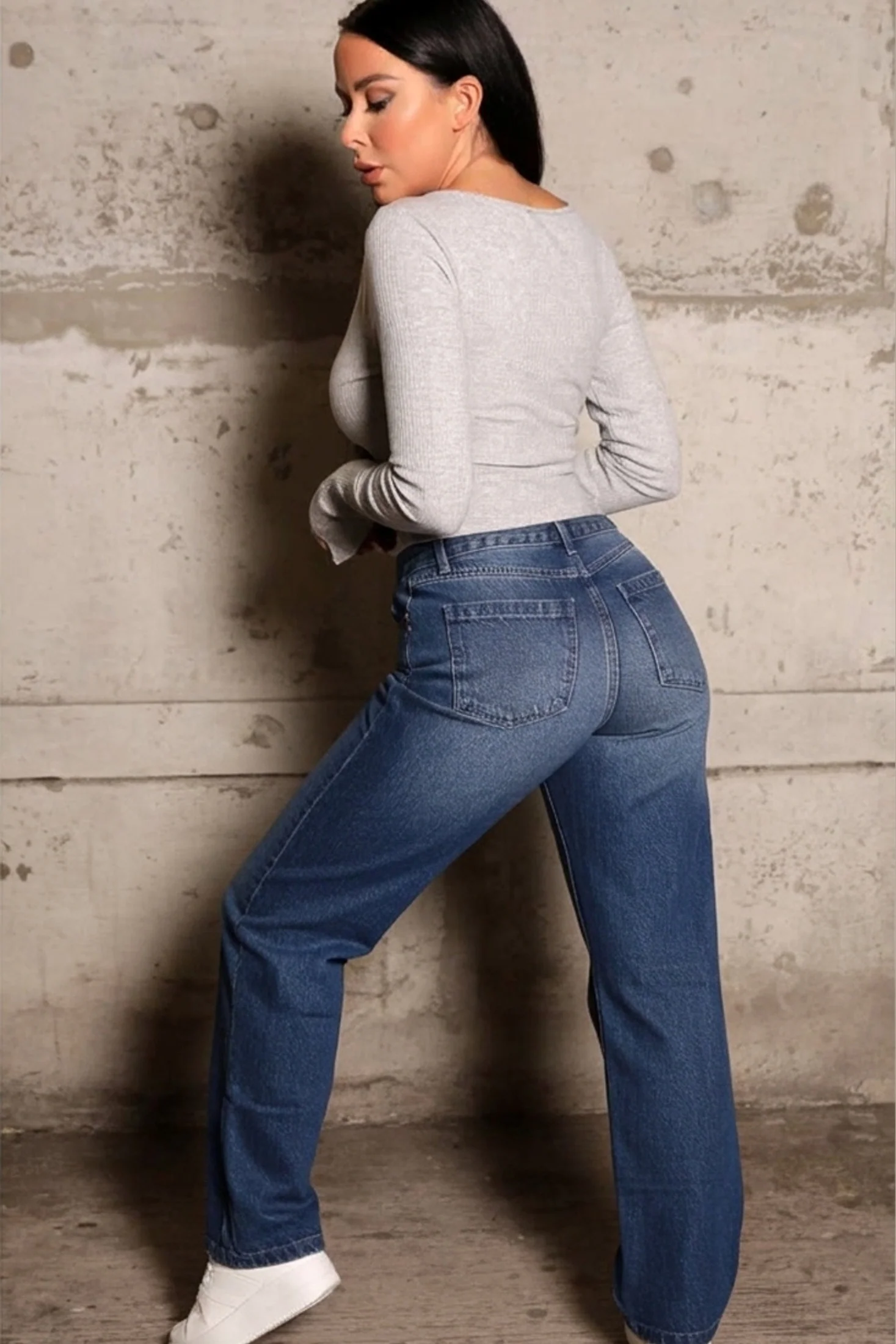 Blue Mid Wash High Waisted Wide Leg Ripped Knee Distressed Denim Jeans - Klara
