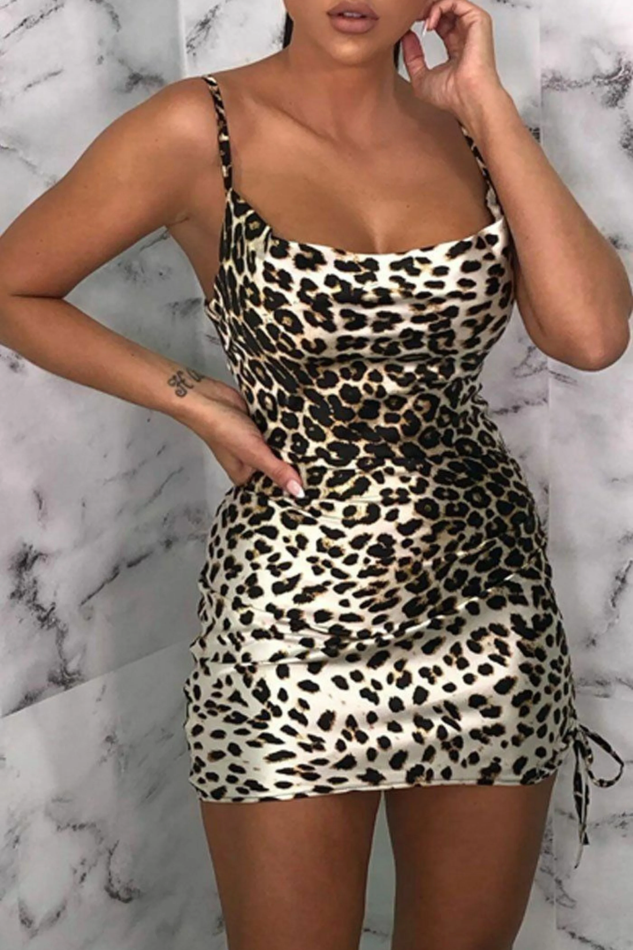 Brown Leopard Print Satin Ruched Side Slip Mini Dress