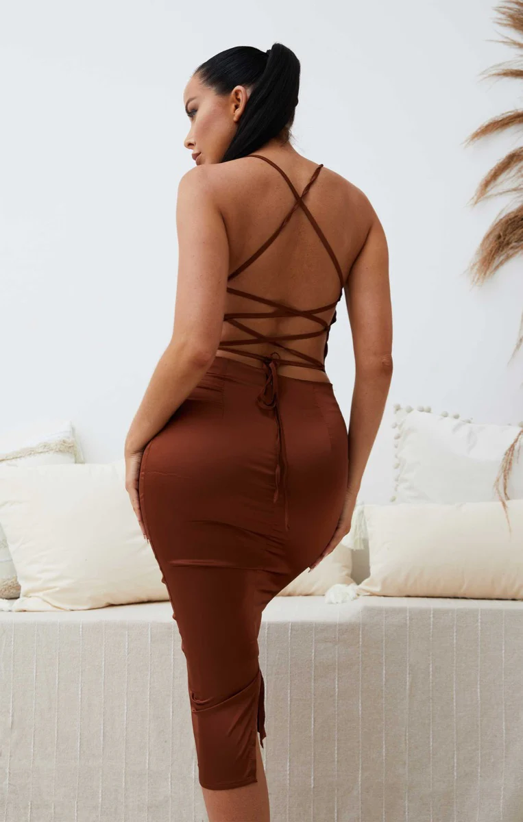 Chocolate Satin Strappy Tie Detail Bodycon Midi Dress - Zyra