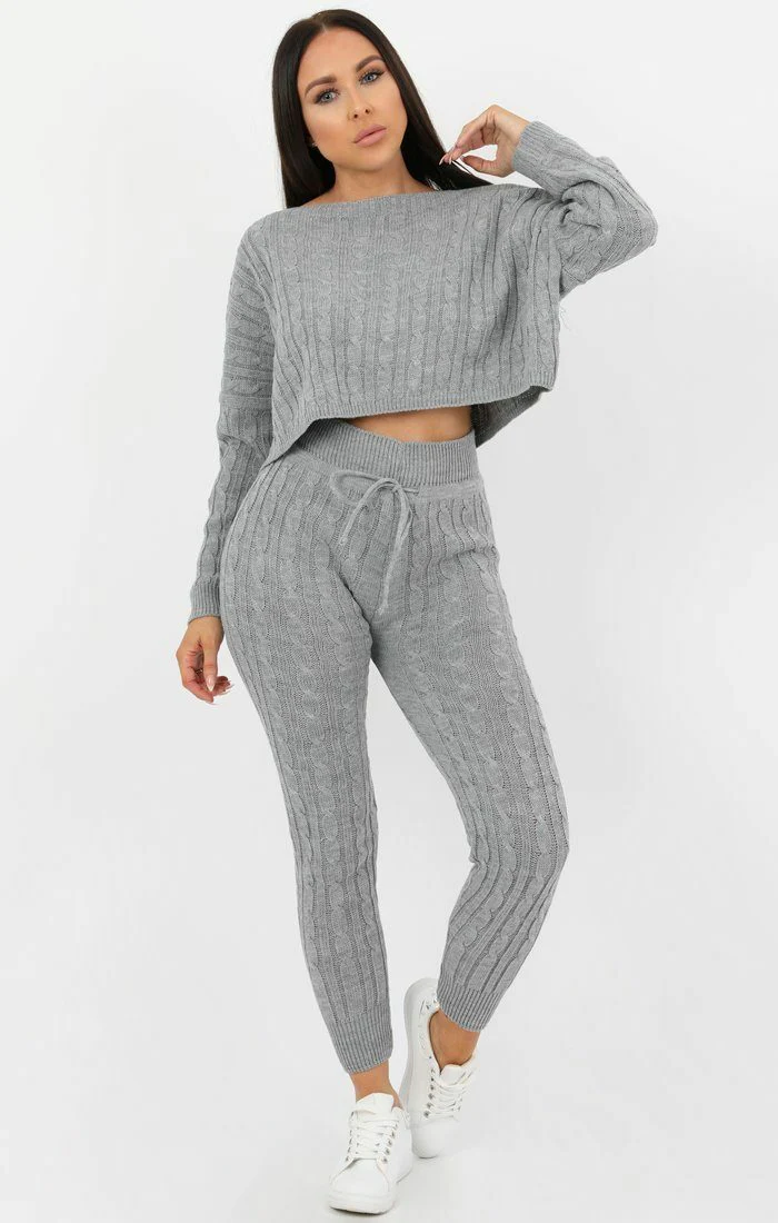 Get comfort and cool with this totally cute Grey Grey Knit Loungewear Set. Featuring a cable knit fabric with a cropped jumper and leggings, style with chunky trainers for a cool everyday vibe.