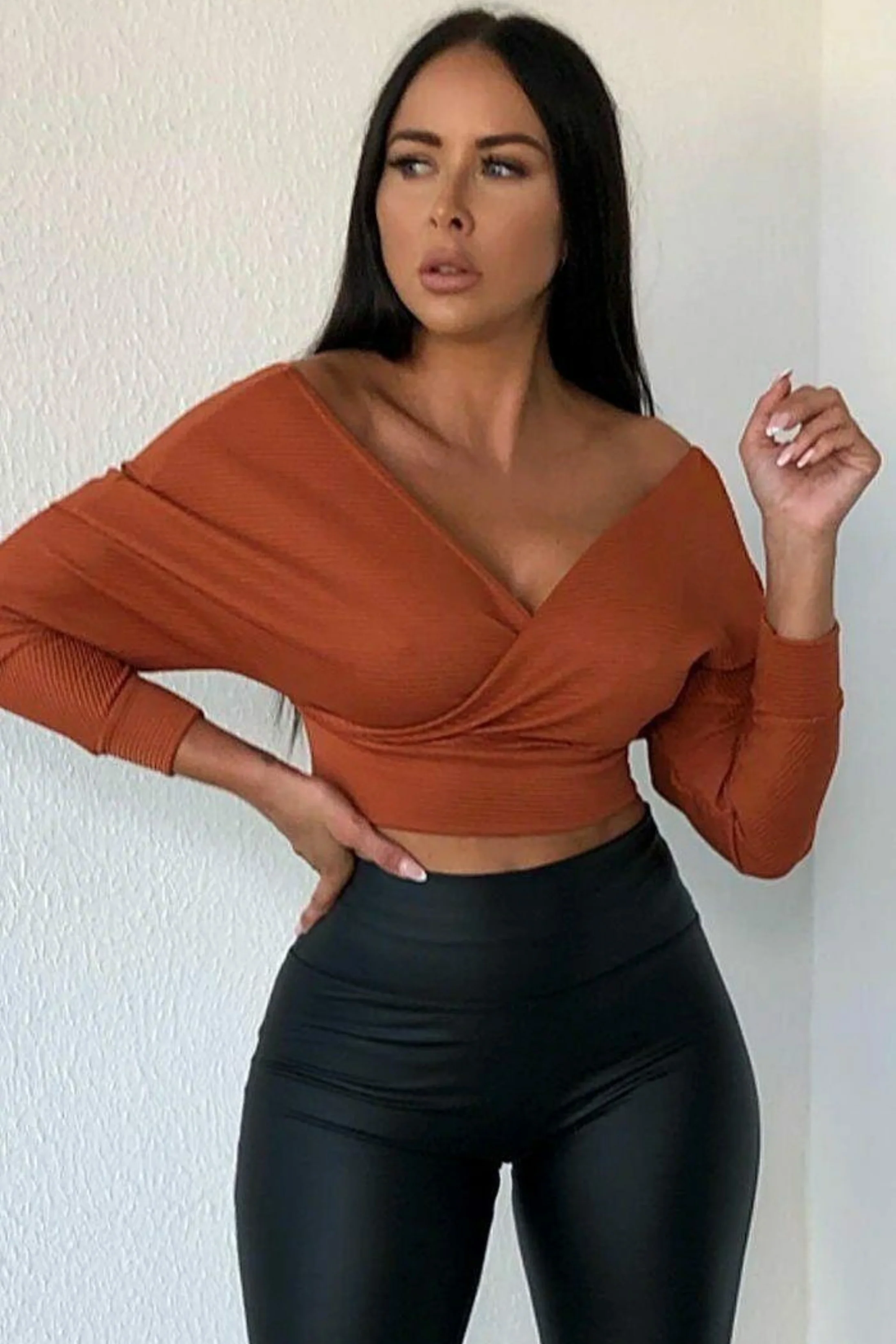 Make it an off the shoulder moment and score some serious fashion points in the Rust Ribbed Off The Shoulder Crop Top. Dress this plunging top up with some ripped jeans and killer heels.
