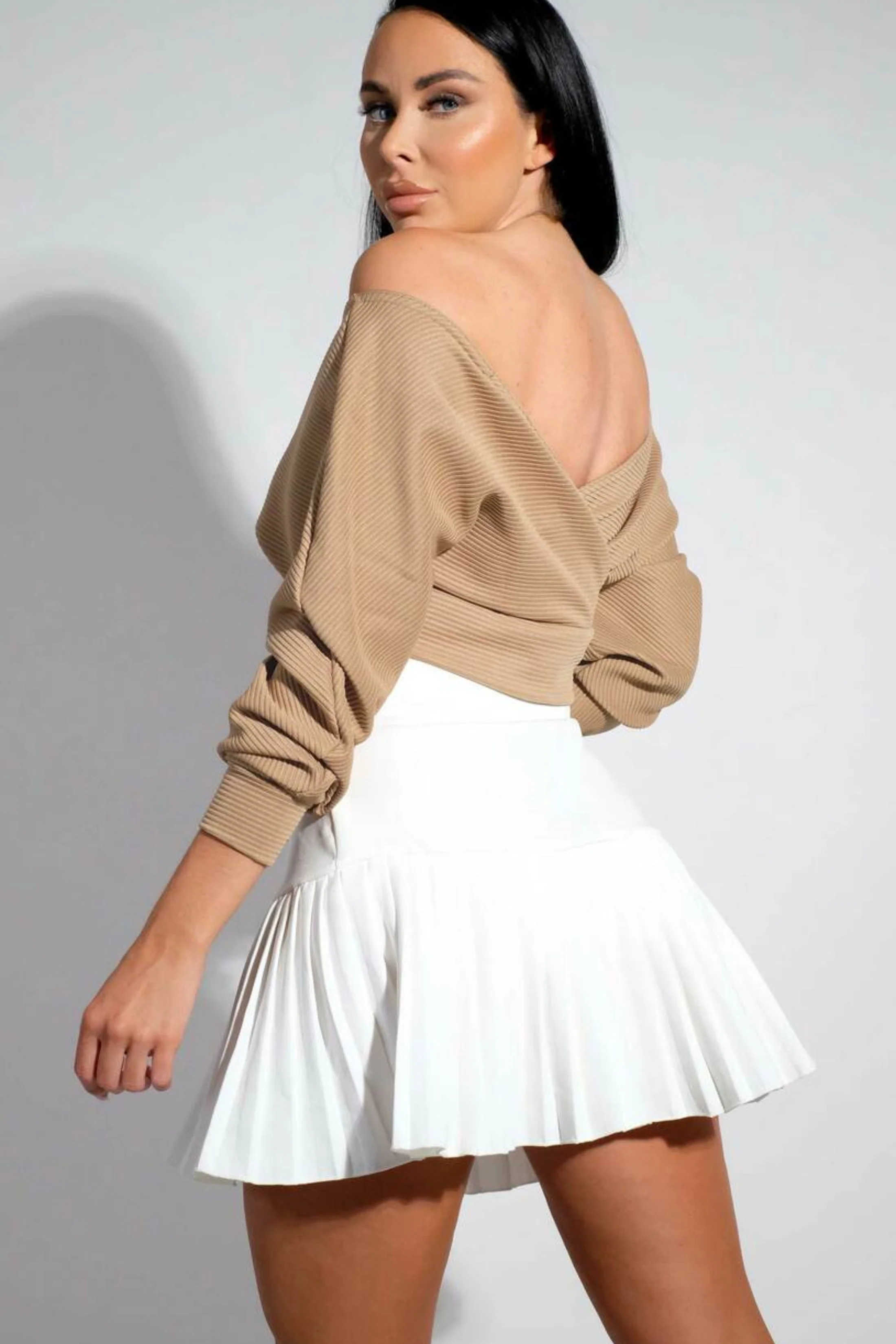 Make it an off the shoulder moment and score some serious fashion points in the Stone Ribbed Off The Shoulder Crop Top. Dress this plunging top up with some ripped jeans and killer heels.