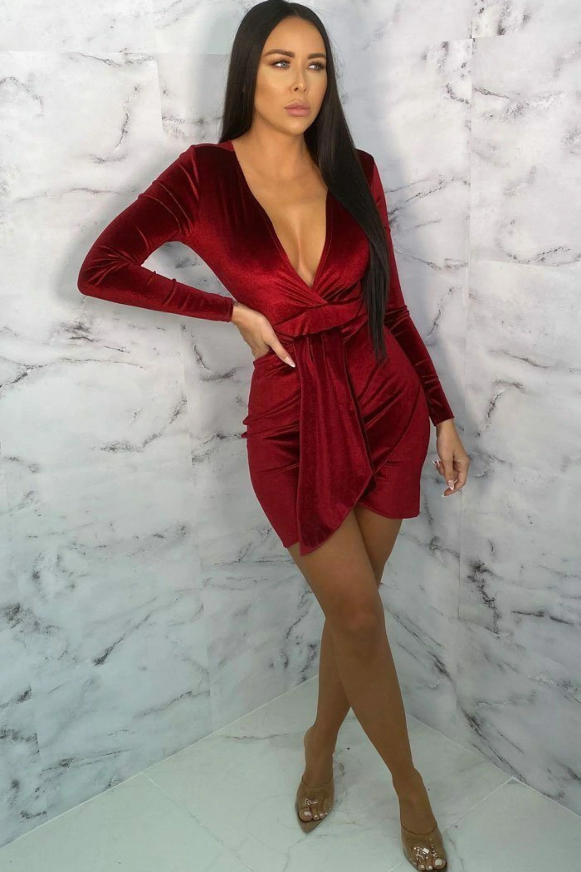 -70%Wine Velvet Tie Front Bodycon Mini Dress - Meeshaā
